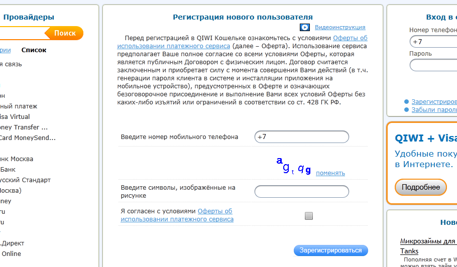 Для того чтобы зарегистрироваться в QIWI достаточно перейти на сайт. Там нажать на кнопку "Зарегистрироваться", потом ввести свой номер телефона (да, QIWI привязывается к вашему номеру телефона, это очень удобно, если вы конечно не меняете постоянно номер), символы с картинки и согласиться с офертой. После этого на указанный номер вам должен прийти ваш пароль для доступа в систему.