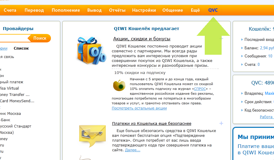 Для начала нам надо будет создать виртуальную кредитку. Жмем на кнопку QVC, теперь жмём "Получить CVC" (за создание карты берут 10 руб., срок службы - год). Теперь вводим свои данные латиницей (фамилия, имя, серия и номер паспорта, адрес соответственно.) После смской вы получите свой номер карты (при желании смс можно удалить, так как на сайте можно повторно выслать себе его в любой момент).