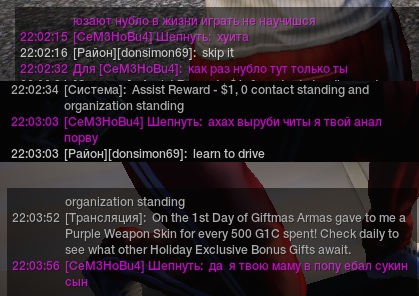 Оскорбления меня нисколько не трогают, но это явный перебор. З.Ы. Оригинальные скрины могу кинуть, если надо. Но заскринил не всё, т.к. кнопка развёртывания чата не назначена и как-то в бою не до неё.