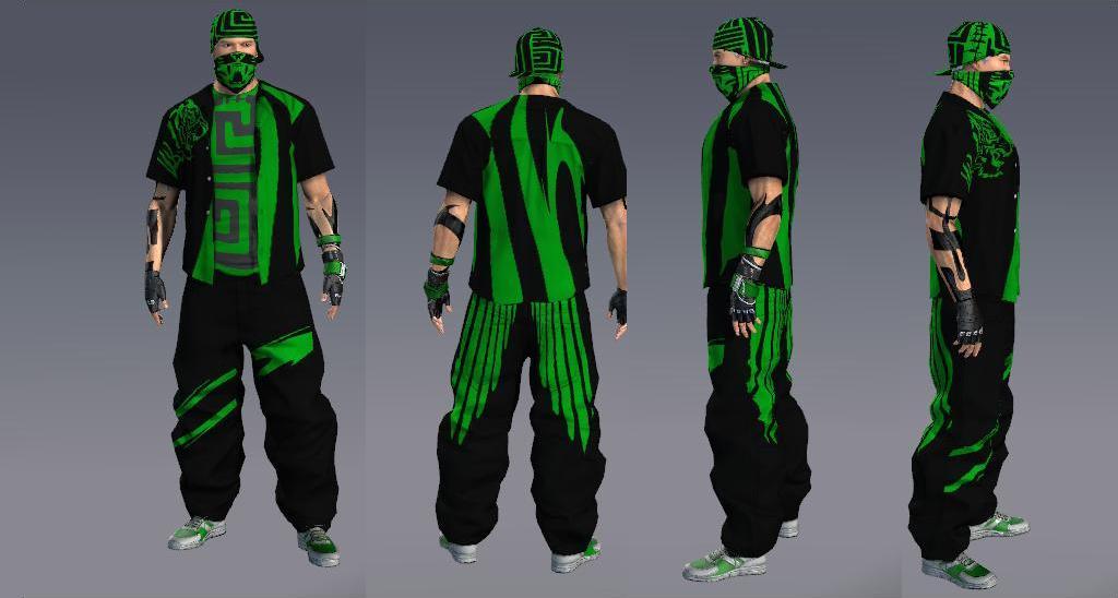 | Маску (на ней 1 татушка будет:D),футболку с длинном рукавом(на неё нацеплю до хрена татушек),штаны(на них тату не будет),кеды для скейтинга(чёрно зелёные),шапку,повязку,перчатки,и Obeyа))))