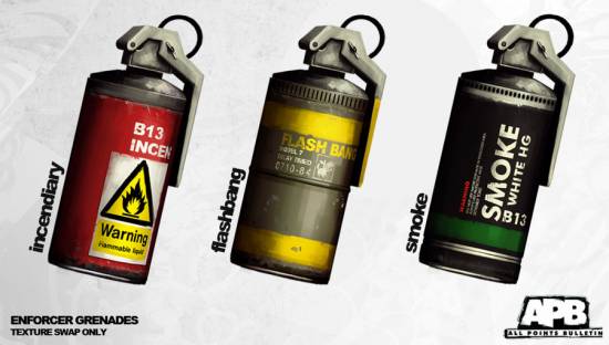 Бред. Миниган в APB? Первое согласен вообще из Halo. Гранаты боевые и так есть. Слепы не будут доступны кримам, а если будут доступны то что бы не оглушать, а слепить. Смоук? Ну можно. Револьвер есть.