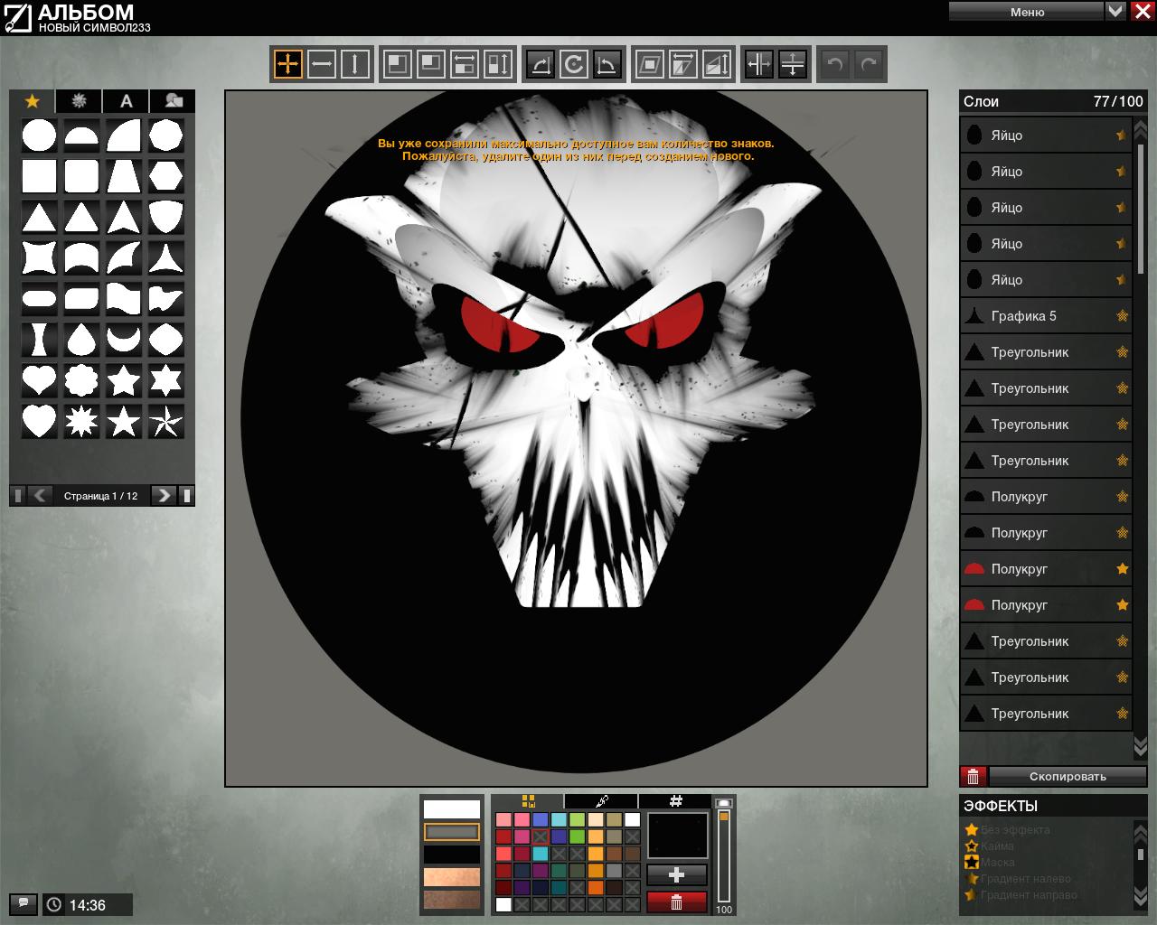 Да просто влево есть меню где нарисован плюсик - типо добавит наклейку и вот внизу вот это длинное верх окно просто нажимаешь на слой и перетаскиваешь его до или после какого он будет нанесён . Вот и всё . Да и кстати вот мой череп .Добавлено (02.11.2010, 08:00)