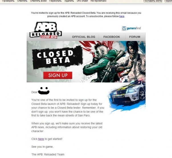 | Quote (Clone_Trooper) МДА))) Сразу понятно что некто англ не знает))) Тем кому пришла вот такая ХЕРЬ Это тупо агит письмо для старых игроков которые ещё не вбили своё мыло для беты. ССыл в письме ведёт сулы http://www.gamersfirst.com/apb/ Вообще то я уже забивал свое мыло у них на сайте до этого письма...
