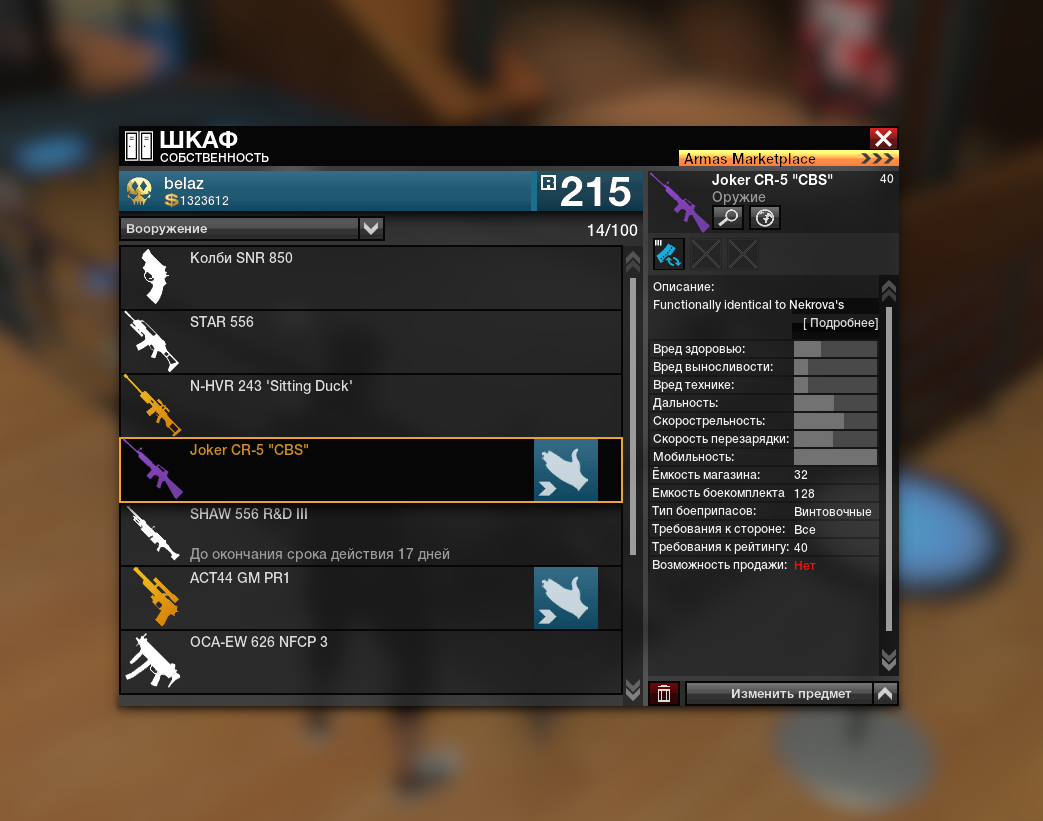 | Quote (belaz) Перм. оружия: Joker CR-5 "CBS" Он не может быть перманентным, он из коробок выпадает на 30 дней- либо у тебя на 30 дней либо ты его путаешь с простым трехслотовым Joker-CR5 из армаса.