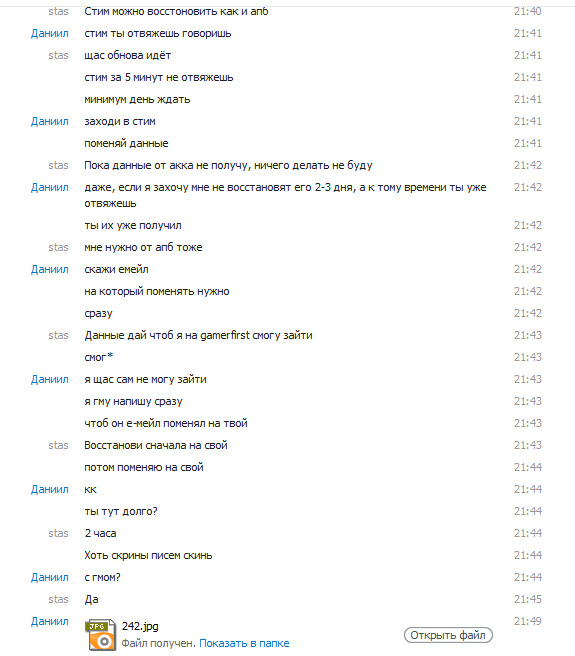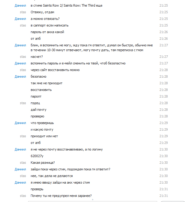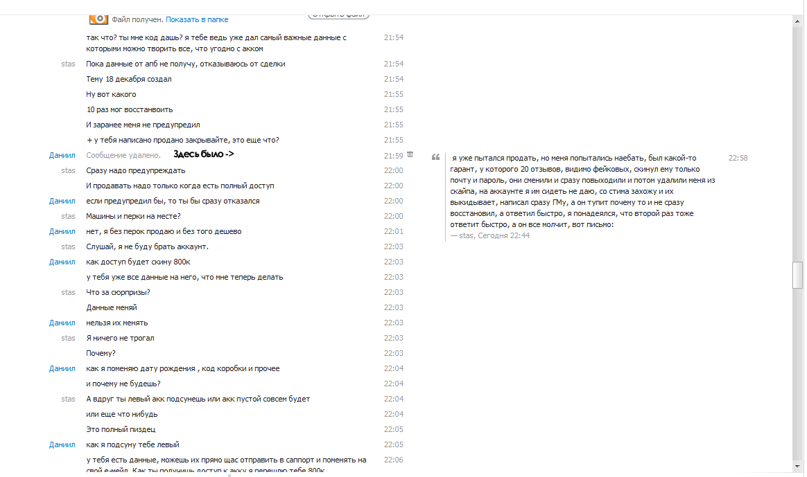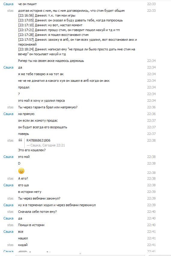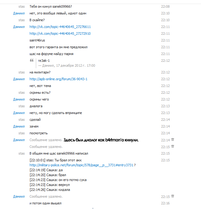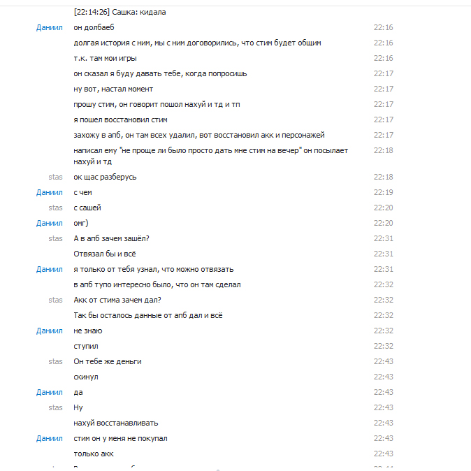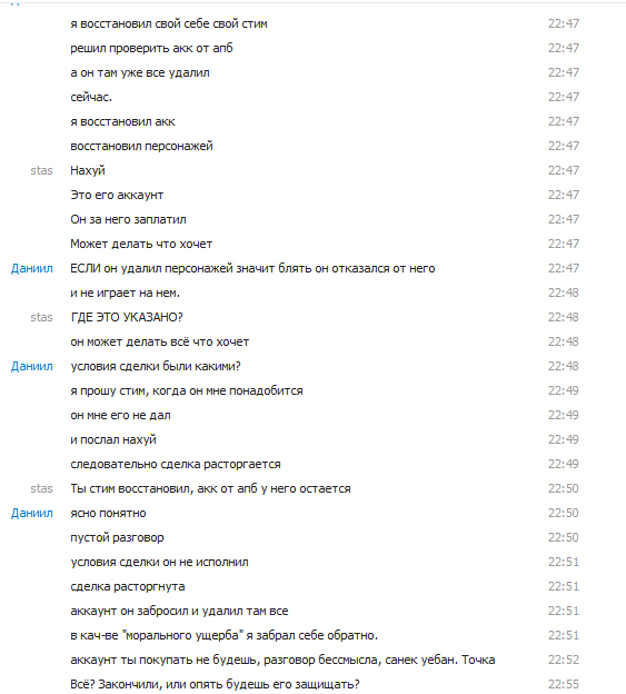 | [03.01.2013 22:47:42] stas: Это его аккаунт [03.01.2013 22:47:48] stas: Он за него заплатил [03.01.2013 22:47:55] stas: Может делать что хочет [03.01.2013 22:47:57] Даниил: ЕСЛИ он удалил персонажей значит блять он отказался от него [03.01.2013 22:48:02] Даниил: и не играет на нем. [03.01.2013 22:48:07] stas: ГДЕ ЭТО УКАЗАНО? [03.01.2013 22:48:16] stas: он может делать всё что хочет [03.01.2013 22:48:43] Даниил: условия сделки были какими? [03.01.2013 22:49:11] Даниил: я прошу стим, когда он мне понадобится [03.01.2013 22:49:14] Даниил: он мне его не дал [03.01.2013 22:49:16] Даниил: и послал на*уй [03.01.2013 22:49:21] Даниил: следовательно сделка расторгается [03.01.2013 22:50:23] stas: Ты стим восстановил, акк от апб у него остается [03.01.2013 22:50:35] Даниил: ясно понятно [03.01.2013 22:50:45] Даниил: пустой разговор [03.01.2013 22:51:08] Даниил: условия сделки он не исполнил [03.01.2013 22:51:10] Даниил: сделка расторгнута [03.01.2013 22:51:24] Даниил: аккаунт он забросил и удалил там все [03.01.2013 22:51:48] Даниил: в кач-ве "морального ущерба" я забрал себе обратно. sanek09966 написал, что ты стим отдал ему бесплатно. И то что ты сначала пишешь одно(почту забыл), потом второе(гарант киданул), позже третье(заплатили, но стим не дают и поэтому восстановил) - очень внушает доверие