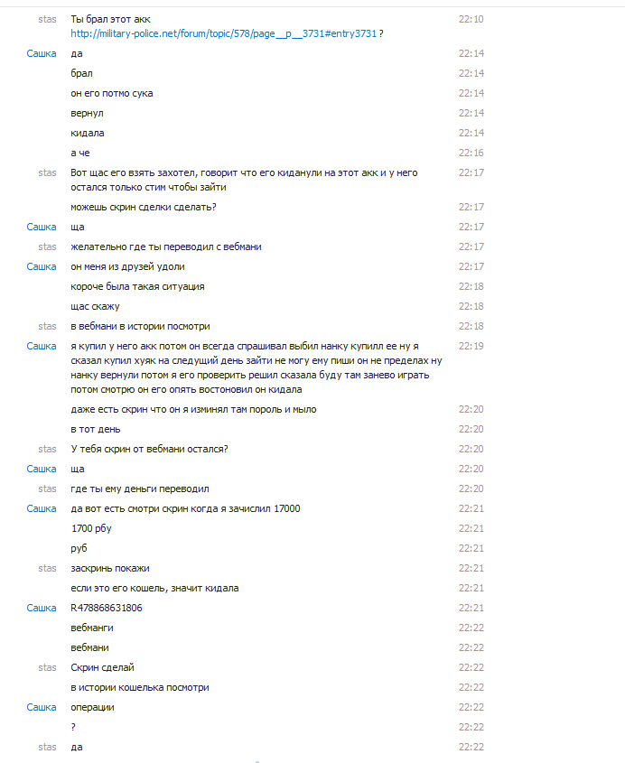 | Пытался кинуть на аккаунт, ник b4rtman, skype turbix1994 Вот его тема http://military-police.net/forum/topic/578/ (Написал, что продал акк), скайп такой же как и здесь - http://apb-online.org/forum/36-9245-1 Уже кинул одного человека(я его знаю и разузнал, в чем дело) Диалог с даниллой: [cut] [/cut] Диалог с Сашей: [cut] [/cut] Док-во что Саша заплатил за аккаунт: [cut] [/cut] Док-во, что на скрине кошелек даниила(До это купил у него Осу нано): [cut] [/cut]